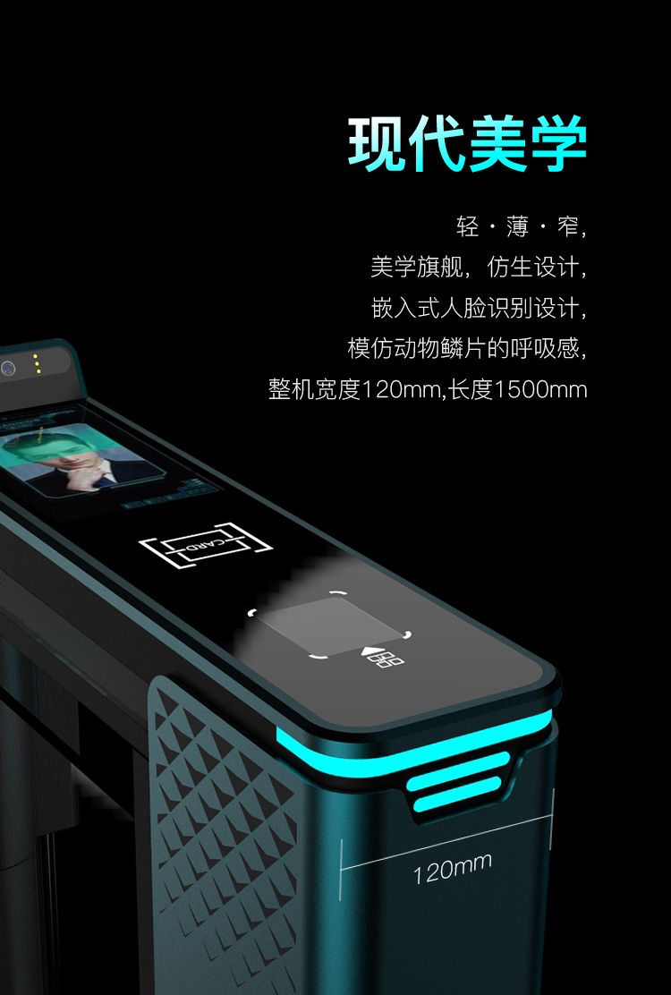 上蓋鋁合金厚度10mm,機(jī)箱外罩鋁合金厚3mm,輕 · 薄 · 窄,美學(xué)旗艦,嵌入式人臉識(shí)別設(shè)計(jì),仿生設(shè)計(jì),模仿動(dòng)物鱗片的呼吸感,整機(jī)寬度120MM ,長(zhǎng)度1500mm