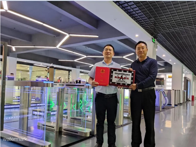 隨后在鐵軍智能展廳,黃云萍先生親身體驗了我司研發的的通道閘產品和智慧校園系統解決方案,并對牌匾的頒發舉行了一個簡單的儀式。