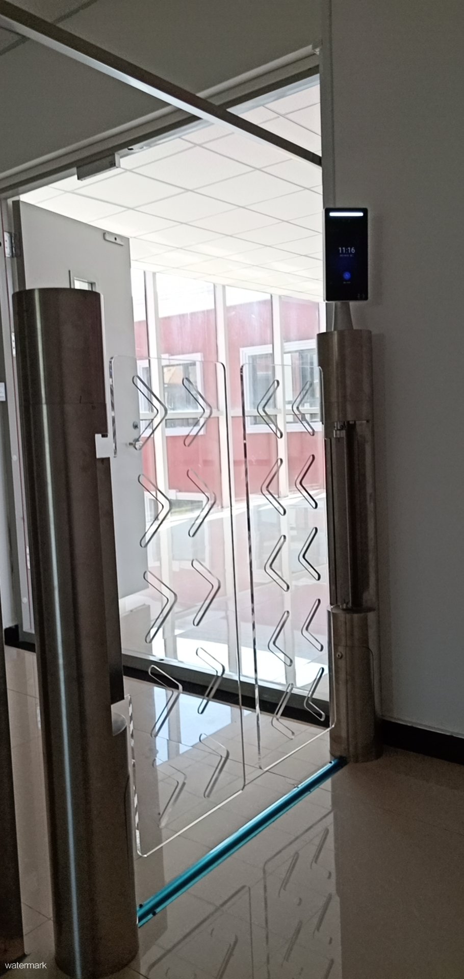 南大奧宇培訓學校為有效確保來訪人員及內部人員通行安全,提升內部安保級別使用了深圳市鐵軍智能科技有限公司的人臉識別圓柱擺閘設備。