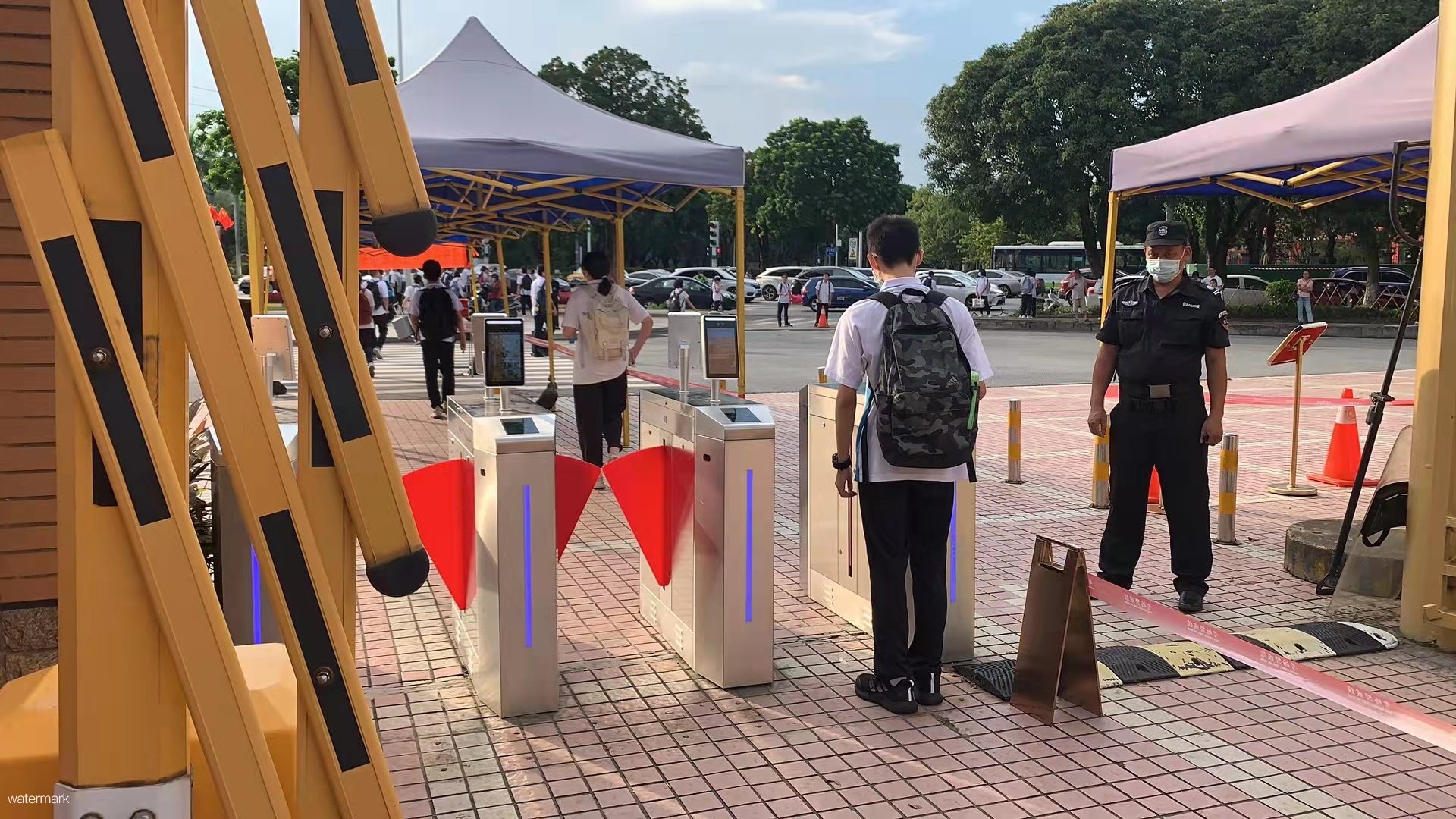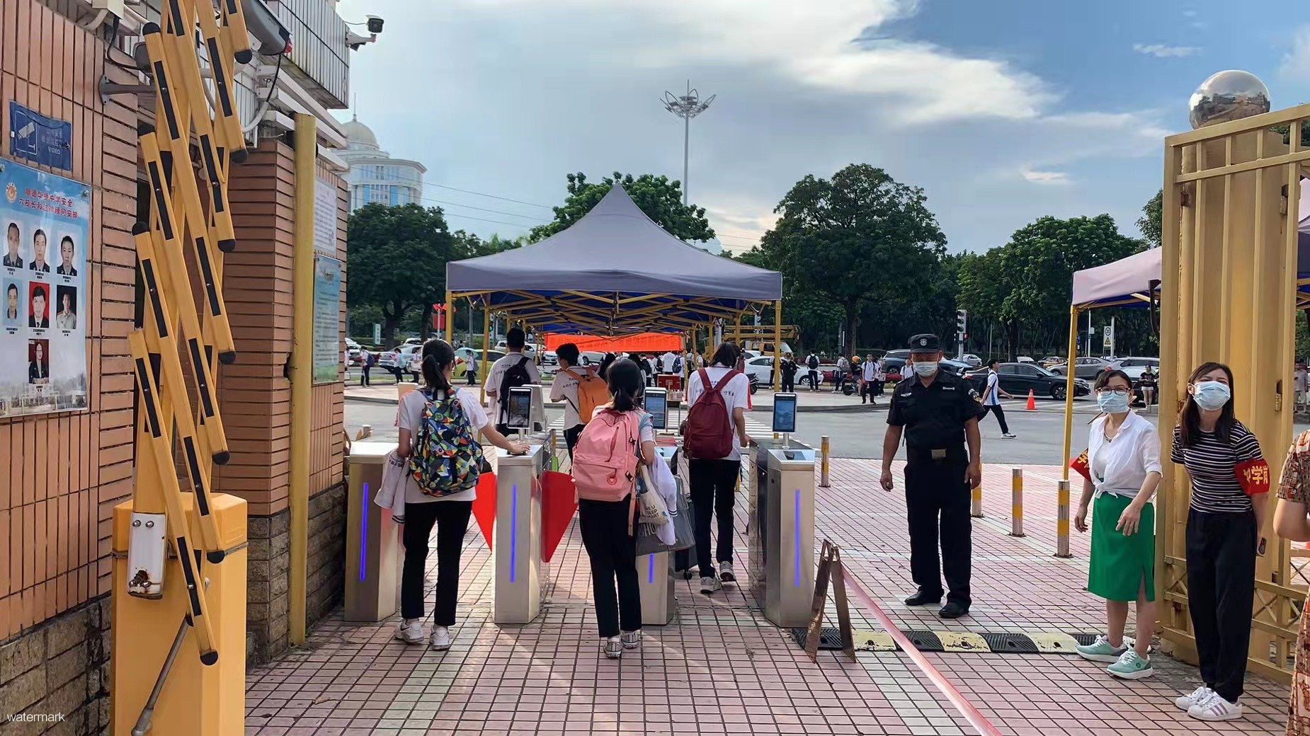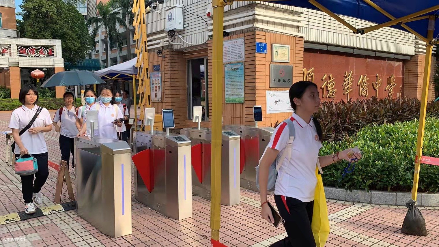 順德華僑中學校園出口安裝了深圳市鐵軍智能科技有限公司的人臉識別翼閘設備,通過即時獲取通行師生信息進行有效比對,防止非本校人員進。