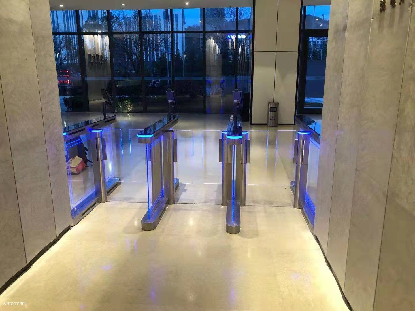 煜大廈選用深圳市鐵軍智能科技有限公司的速通門,主要是考慮到寫字樓人流量一般較集中,尤其是在每日的上下班時,不同時段大批次的人群,在同時行過速通門速通門的通行速度,一定是要求要快。在通行速度方面考慮,寫字樓的門禁設備是需要選擇通行速度較快的翼閘或擺閘,而速通門的通行速度則較翼閘、擺閘更加高效。