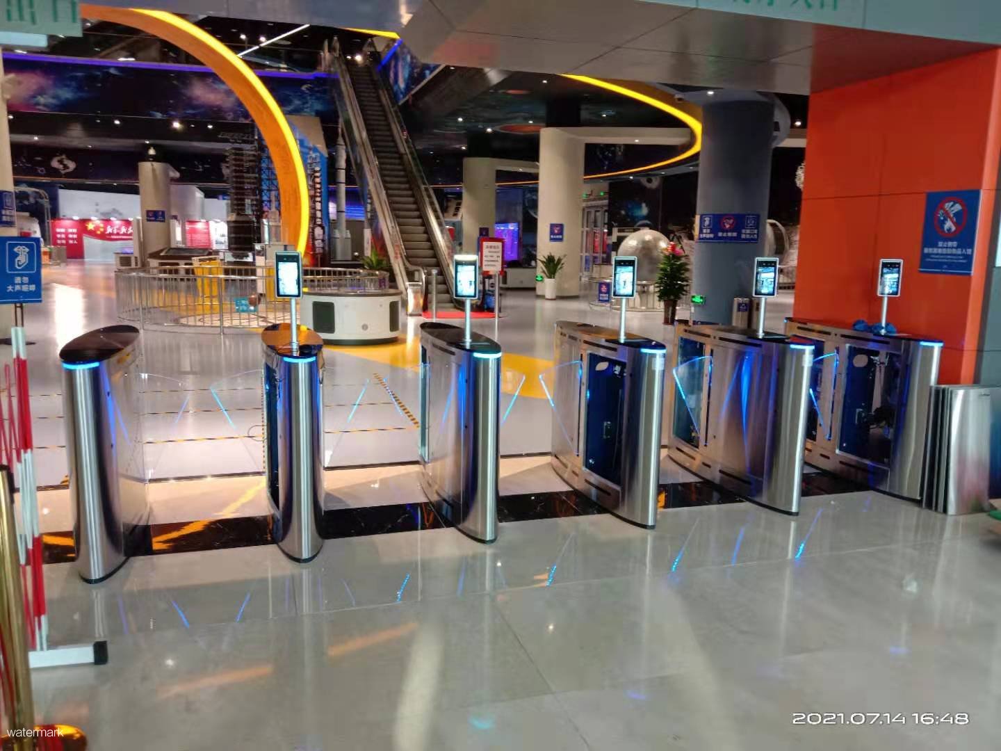 寧夏科技館在出入口檢票處,應用了深圳市鐵軍智能科技有限公司的檢票翼閘設備。入館游覽群眾可通過手機掃描二維碼或者人臉識別核驗通行。