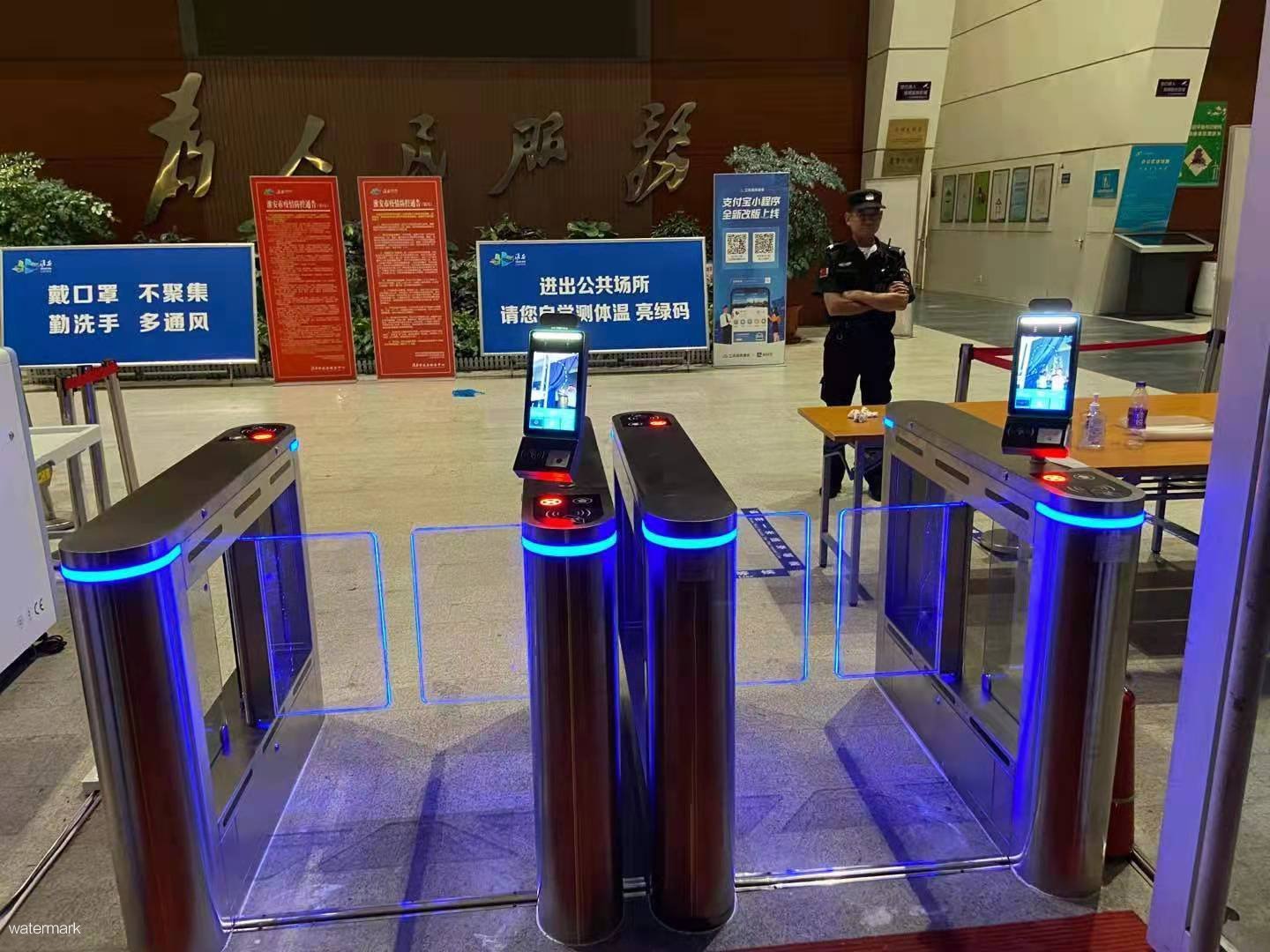 政務中心多措并舉,優化疫情防控措施,啟用了深圳市鐵軍智能科技有限公司的測溫人臉識別小擺閘+“蘇康碼(江蘇健康碼)”設備,積極落實政務服務中心防疫工作。