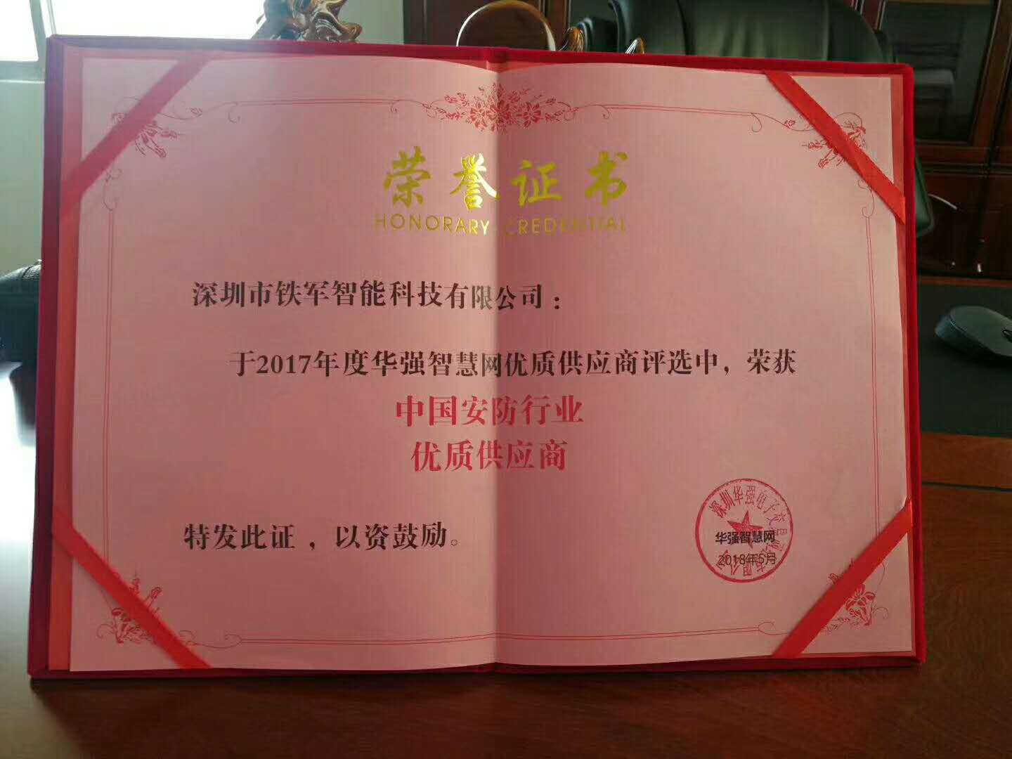 2018 年 5 月21日,鐵軍智能獲得由華強智慧網頒發的“2017年度中國安防行業優質供應商獎”。該獎項的授予為了表彰長期以來廣大客戶對鐵軍智能的信任和支持。銷售經理譚寧遠先生代表鐵軍智能領取了獎項。