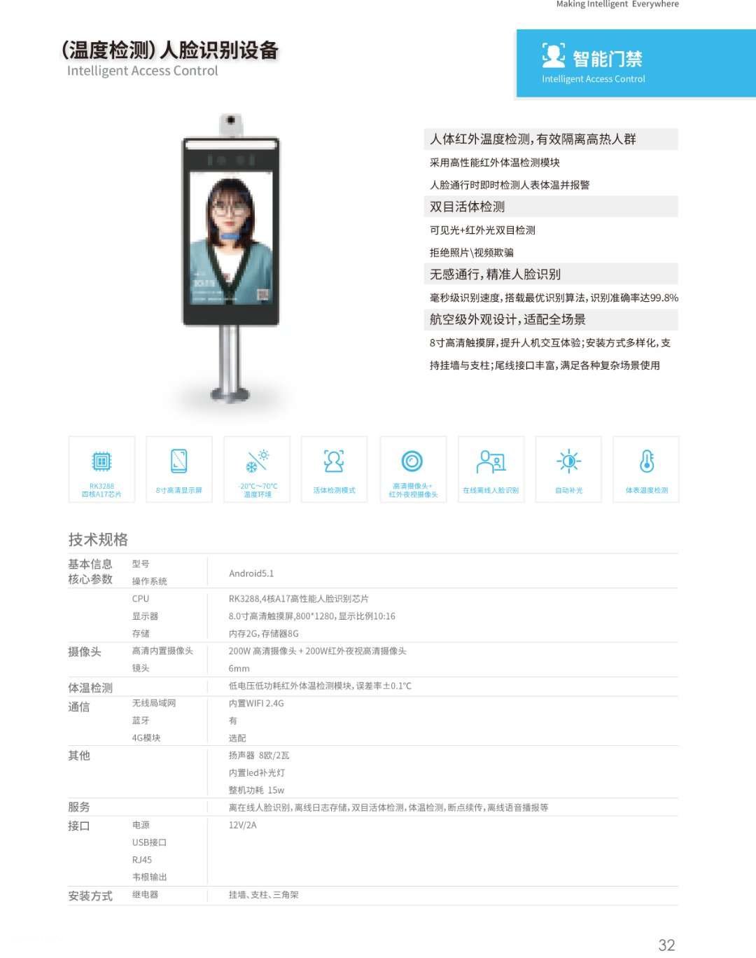 鐵軍智能這套系統集測溫人臉識別、熱成像人臉識別功能于一體的門禁管理方案。可進行實時的無感體溫檢測、語音播報,精準識別體溫異常人員并示警,所有識別記錄及體溫數值均上傳至云端平臺,管理人員可隨時查看溯源,有效助力安全復工,因其部署快速、識別精準、安全高效,收獲了一片好評。相比手動檢測,AI測溫人臉識別和熱成像人臉識別系統與人手動測溫相比效率上大幅提升,能在一定程度上避免人群密集場所的人員滯留。其次,AI測溫人臉識別和熱成像人臉識別系統系統為無感測溫,不需要打斷人員的通行,提升通行速度。再有是測溫的精準度,目前產品溫差在±0.3°C,利用深度學習算法輔助物理建模,顯著提高了測溫精度;減少了人與人的接觸和人員的投入,降低了一線工作人員的風險。廣泛應用政府機構,市場,學校,小區等領域。